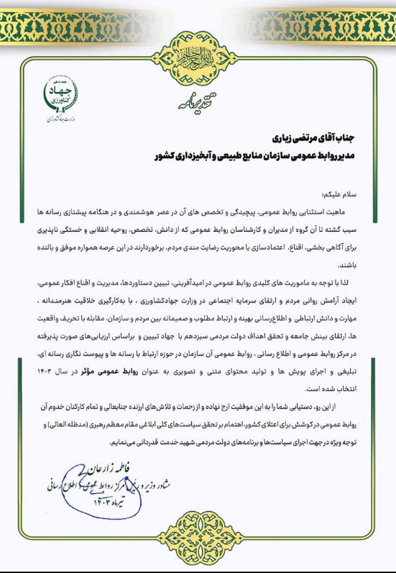 فاطمه زارعان در تقدیرنامه به روابط عمومی سازمان منابعطبیعی و آبخیزداری کشور همچنین افزود: با توجه به مأموریت های کلیدی روابطعمومی در امیدآفرینی، تبیین دستاوردها، مدیریت و اقناع افکار عمومی، ایجاد آرامش روانی مردم و ارتقای سلامت اجتماعی در وزارت جهاد کشاورزی با بکارگیری خلاقیت هنرمندانه، مهارت و دانش ارتباطی و اطلاع رسانی بهینه و ارتباط مطلوب و صمیمانه بین مردم و سازمان، مقابله با تحریف واقعیت ها، ارتقای بینش جامعه و تحقق اهداف دولت مردمی سیزدهم با جهاد تبیین و بر اساس ارزیابی های صورت پذیرفته در مرکز روابط عمومی و اطلاع رسانی، روابط عمومی آن سازمان در حوزه ارتباط با رسانه ها و پیوست نگاری رسانه ای، تبلیغی و اجرای پویش ها و تولید محتوای متنی و تصویری به عنوان روابط عمومی مؤثر در سال 1403 انتخاب شده است.